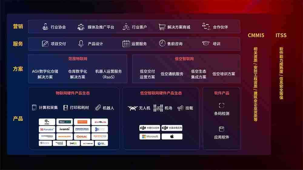 聚合国内外先进的物联网硬件产品品牌,,聚焦数字化仓储、、、、机器人运营、、、低空智联网等领域,,,,共同打造适合客户业务场景的解决方案并提供交付服务