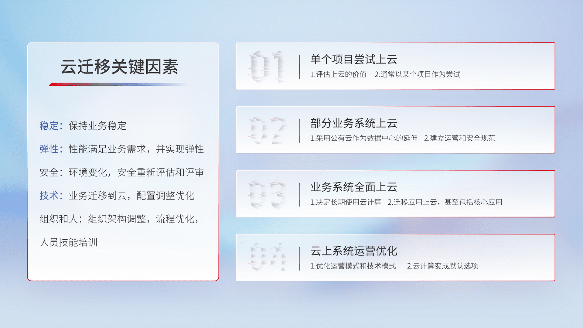 结合实际业务,,从规划设计、、、、云平台选型、、云原生改造、、、、数据迁移、、、、集成交付,,,,迁移全过程为客户识别最佳上云路径,,,做好风险识别管理,,,设计网络架构、、、身份权限、、、安全审计合规、、、、操作审计、、日志审计、、、、监控告警策略、、多站点容灾设计等,,对云上基础设施进行整体规划,,,提升IT治理水平,,以满足弹性、、高可用、、、、高性能的需求。。。。