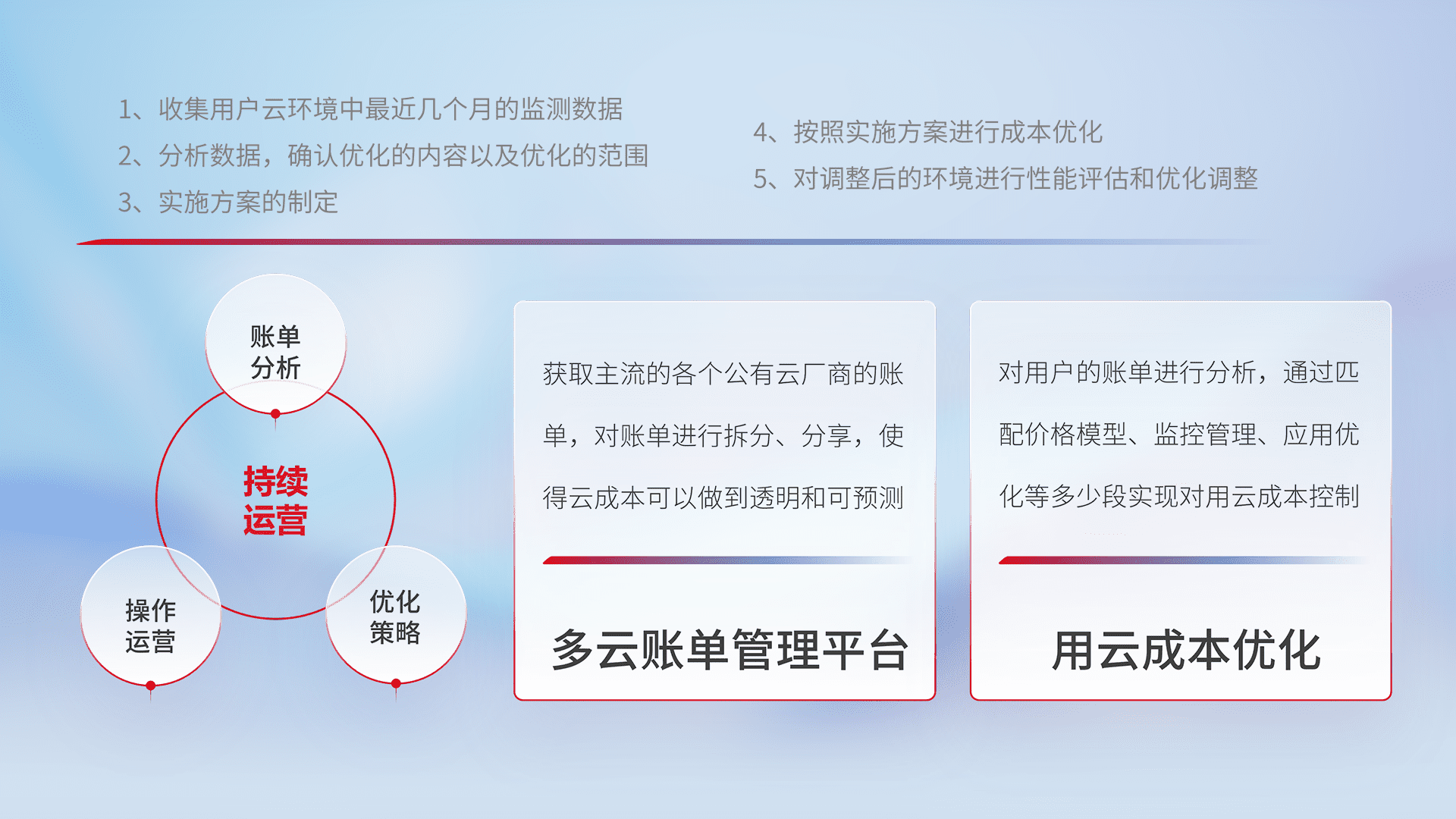 通过多云纳管,,,以统一的资源数据模型把客户的云资源进行抽象和封装,,进而实现对多云资源的统一操作,,,保障云资源管理的可靠性、、、稳定性与可用性。。量身定制化运维内容,,,配置、、、、开发运维、、补丁管理、、、备份、、、、监控、、、、认证和访问管理、、、、审计和日常巡检等,,,,保障在用云过程中的可靠度,,稳定度以及高可用率。。。。